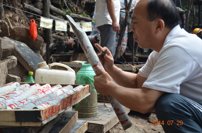 該項(xiàng)目是我隊(duì)繼小秦嶺整裝勘查潼關(guān)自有礦權(quán)區(qū)中深部探礦系統(tǒng)工程之后的又一探礦項(xiàng)目。在總公司領(lǐng)導(dǎo)的關(guān)心支持下,隊(duì)主要領(lǐng)導(dǎo)非常重視,多次前往項(xiàng)目實(shí)施地進(jìn)行現(xiàn)場(chǎng)檢查指導(dǎo)。目前,項(xiàng)目相關(guān)手續(xù)辦理及鉆探施工正有序進(jìn)行,總體進(jìn)展順利,鉆孔不同深度見有多層礦化。在檢查ZK503提取的巖心時(shí),王隊(duì)長(zhǎng)手持地質(zhì)放大鏡仔細(xì)查看,他要求施工和相關(guān)技術(shù)人員要隨時(shí)注意巖心變化情況,特別對(duì)不同標(biāo)高段出現(xiàn)的不同地質(zhì)情況要認(rèn)真記錄、仔細(xì)分析、及時(shí)報(bào)告,不能漏掉任何細(xì)節(jié)。